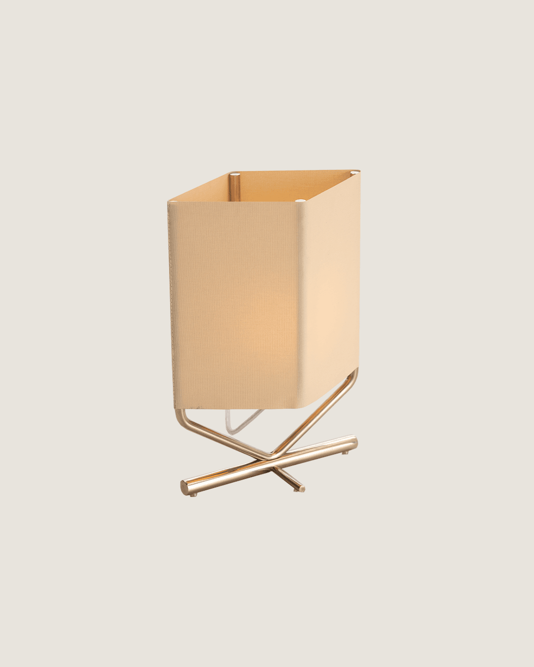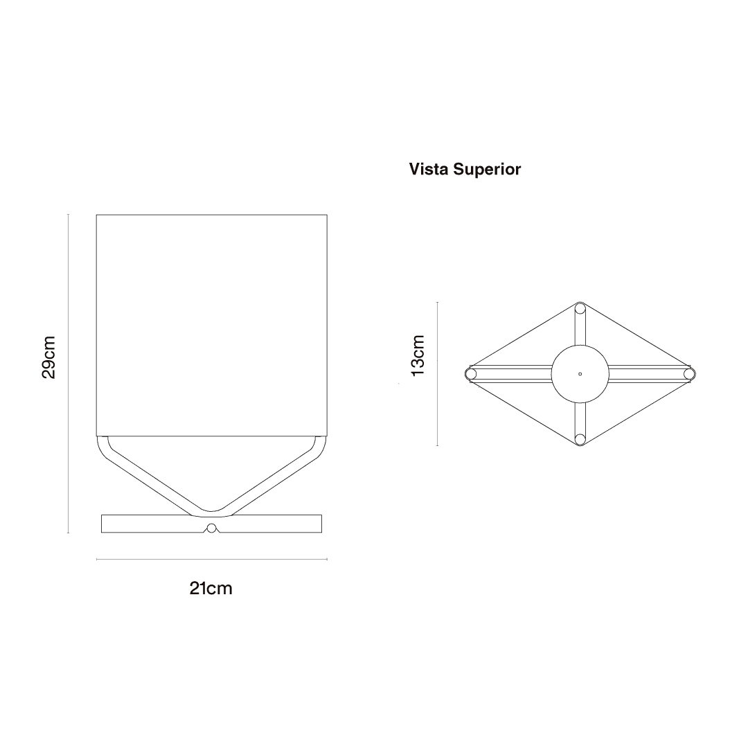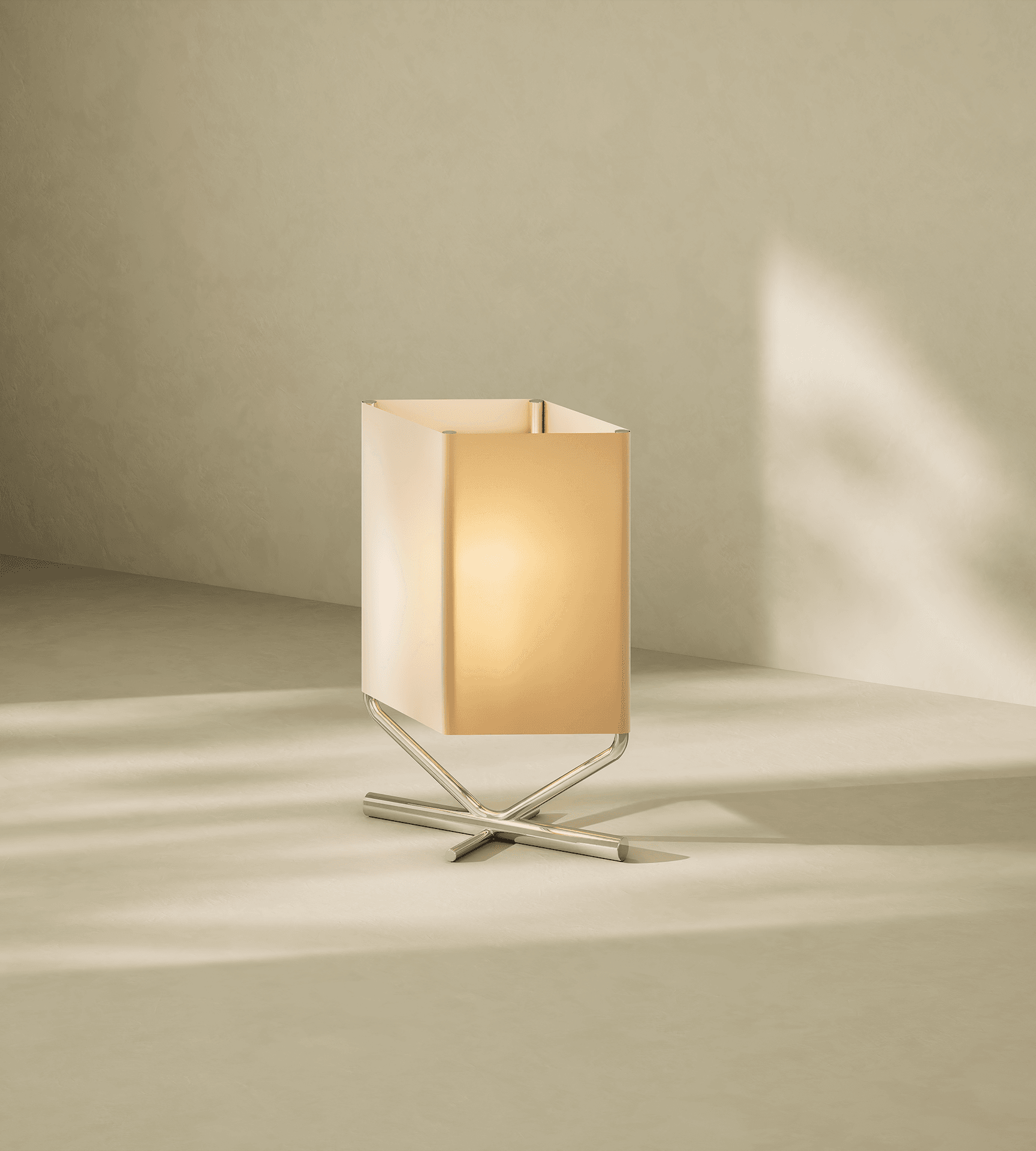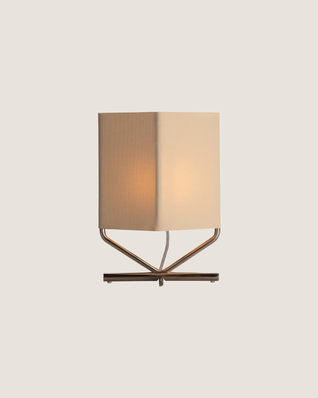 Lámpara de mesa de luz difusa compuesta por una estructura filar niquelada donde tensa una pantalla textil.