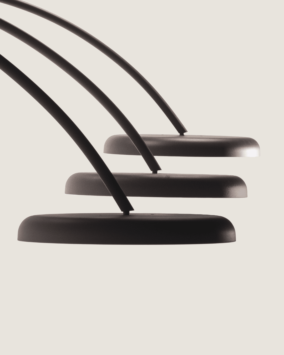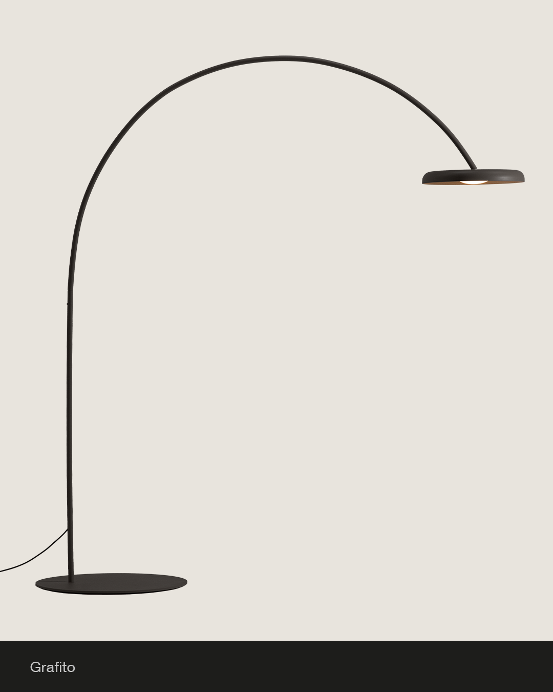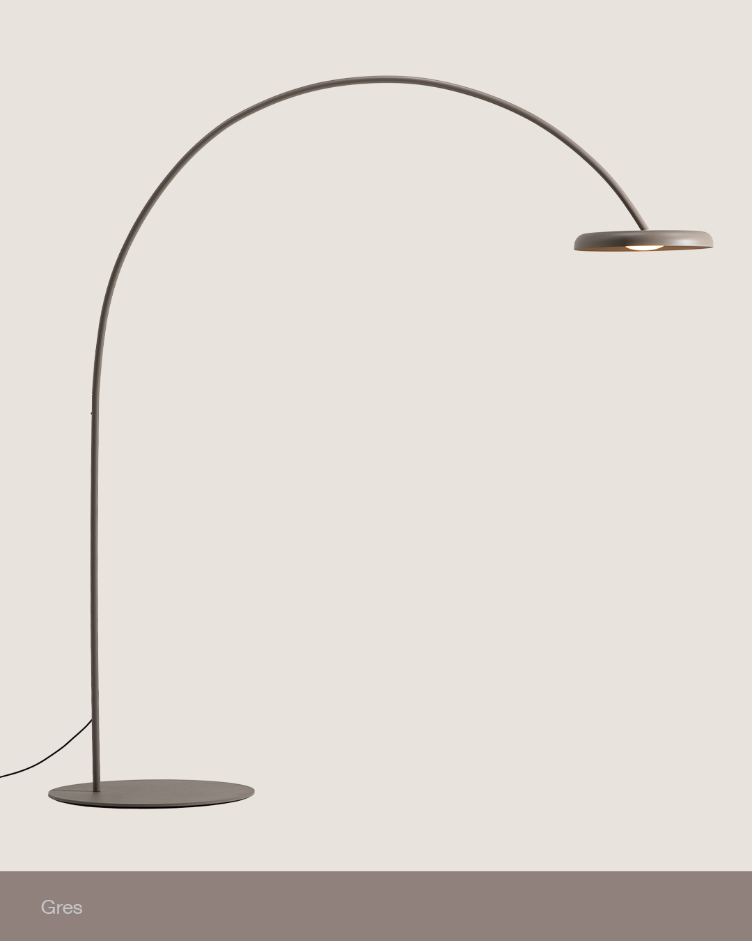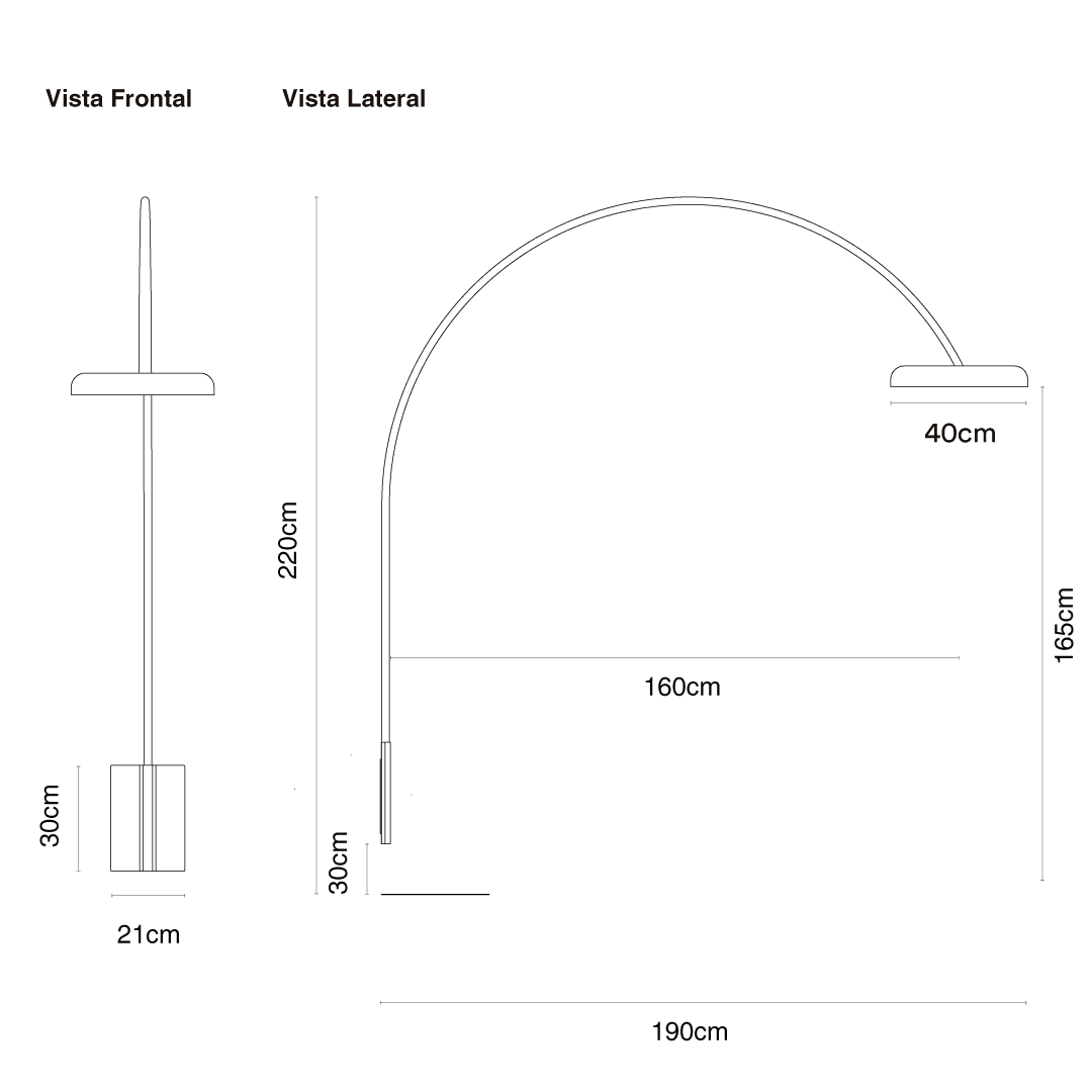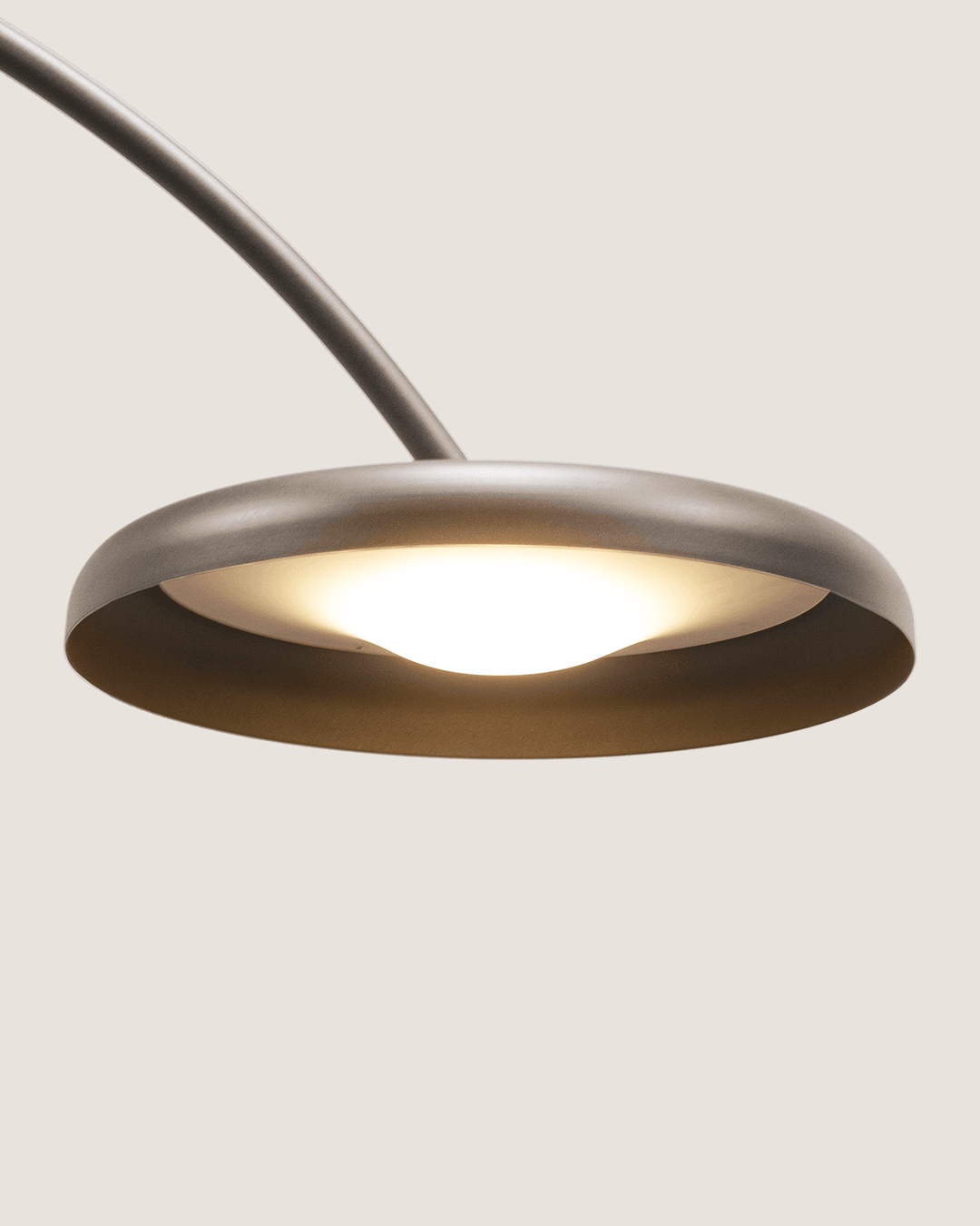 Lámpara arco aplique compuesta por estructura de caño que sostiene una pantalla de luz difusa.