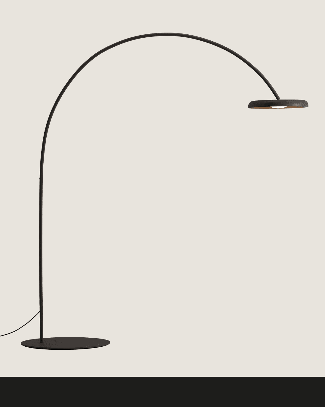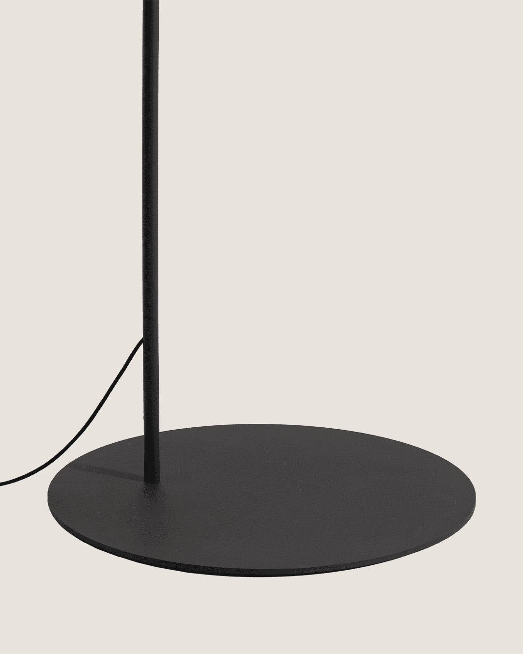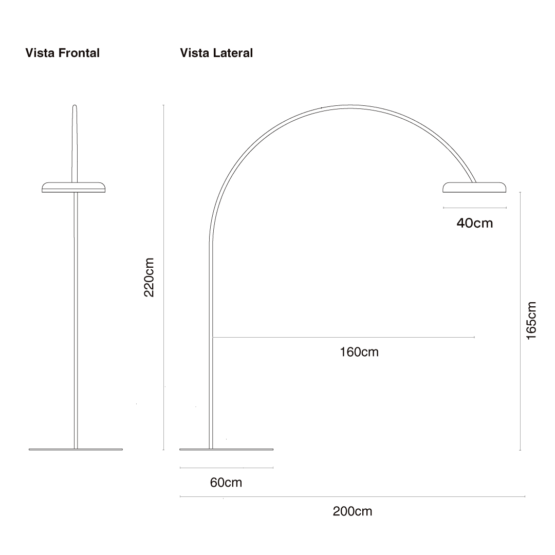 Lámpara de pie arco compuesta por una base de acero y estructura de caño que sostiene una pantalla de luz difusa. Conjunto eléctrico del mismo color de la luminaria con regulador dimmer con posibilidad de ajuste de la intensidad del flujo luminoso.