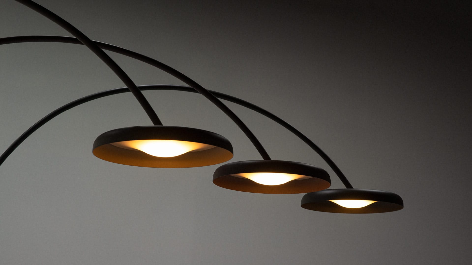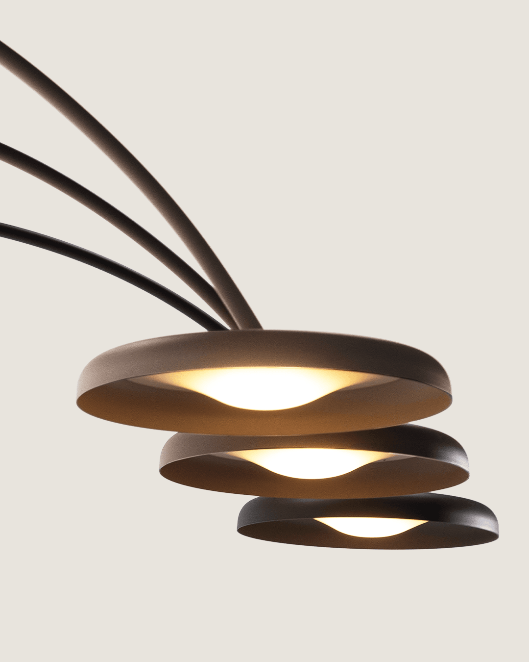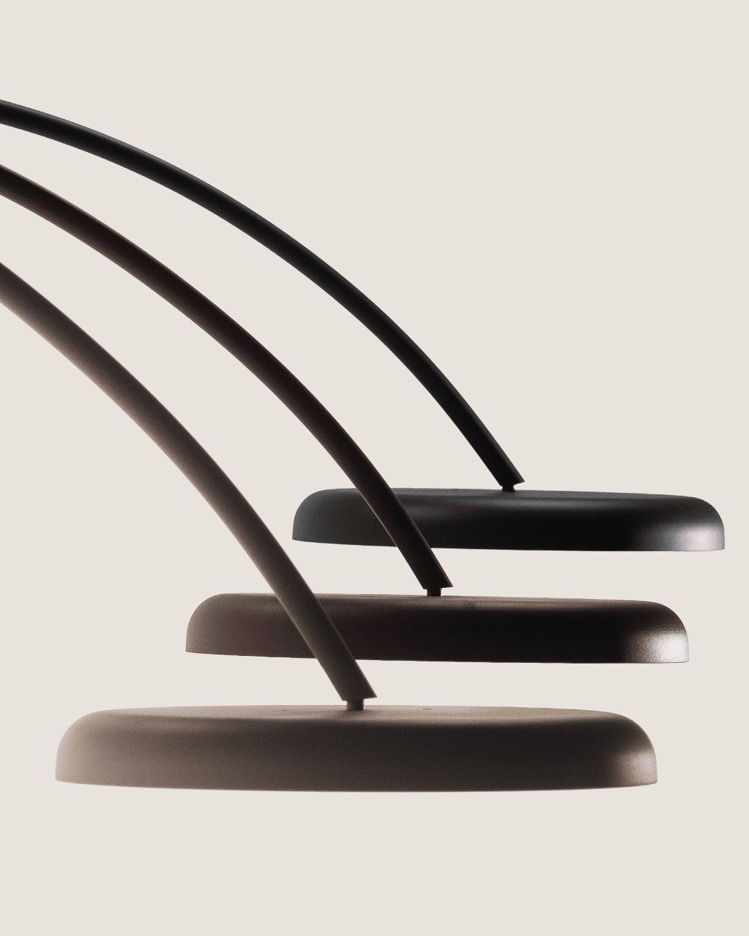 Lámpara de pie arco compuesta por una base de acero y estructura de caño que sostiene una pantalla de luz difusa. Conjunto eléctrico del mismo color de la luminaria con regulador dimmer con posibilidad de ajuste de la intensidad del flujo luminoso.