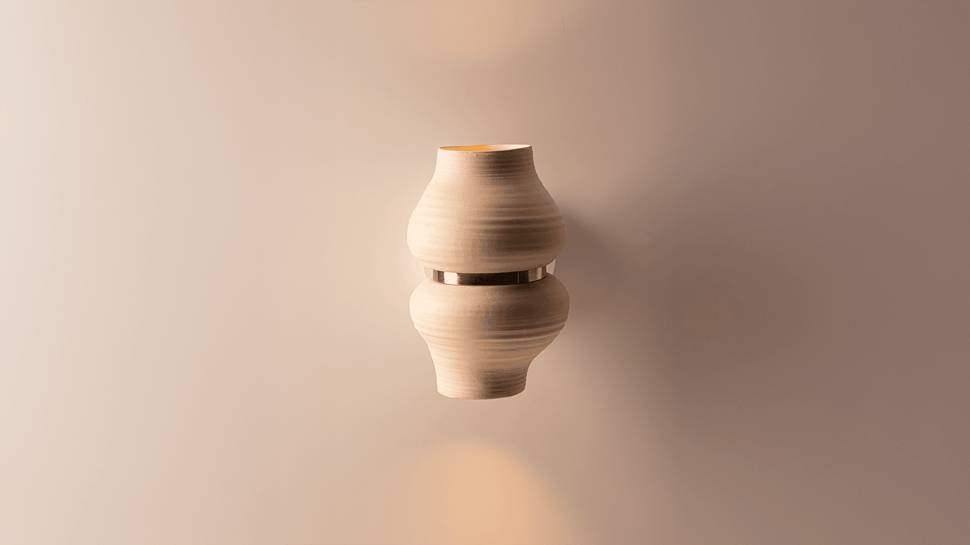 NUDO es el encuentro. Tradición de nuestra tierra y la búsqueda de una identidad propia en el diseño. Una dualidad en la que las ambas partes quedan ligadas fortaleciéndose mutuamente. Lámpara de aplique directa bidireccional. Cuerpo en cerámica hecho a mano y aro metálico. Disco de aplique de acero blanco o negro.