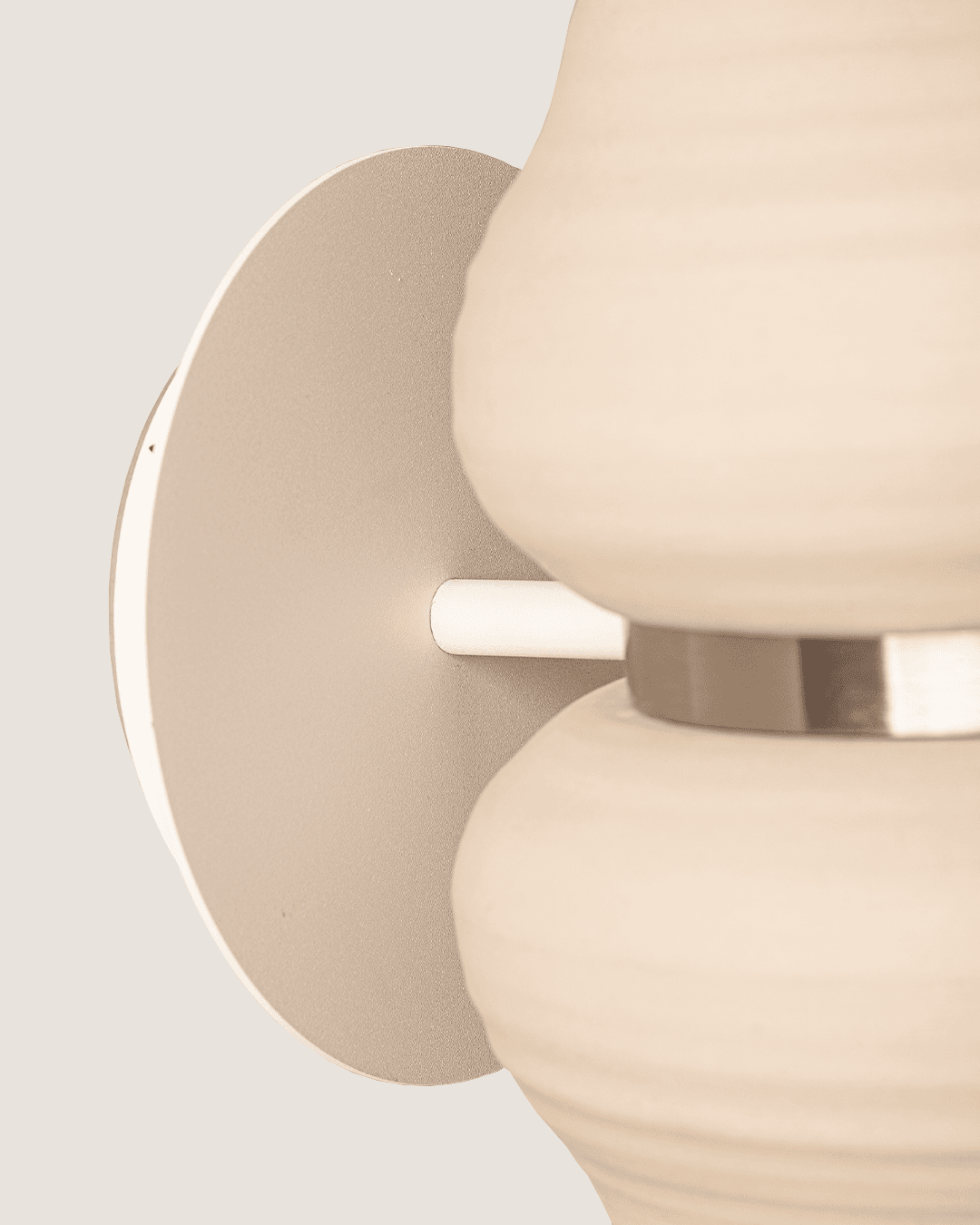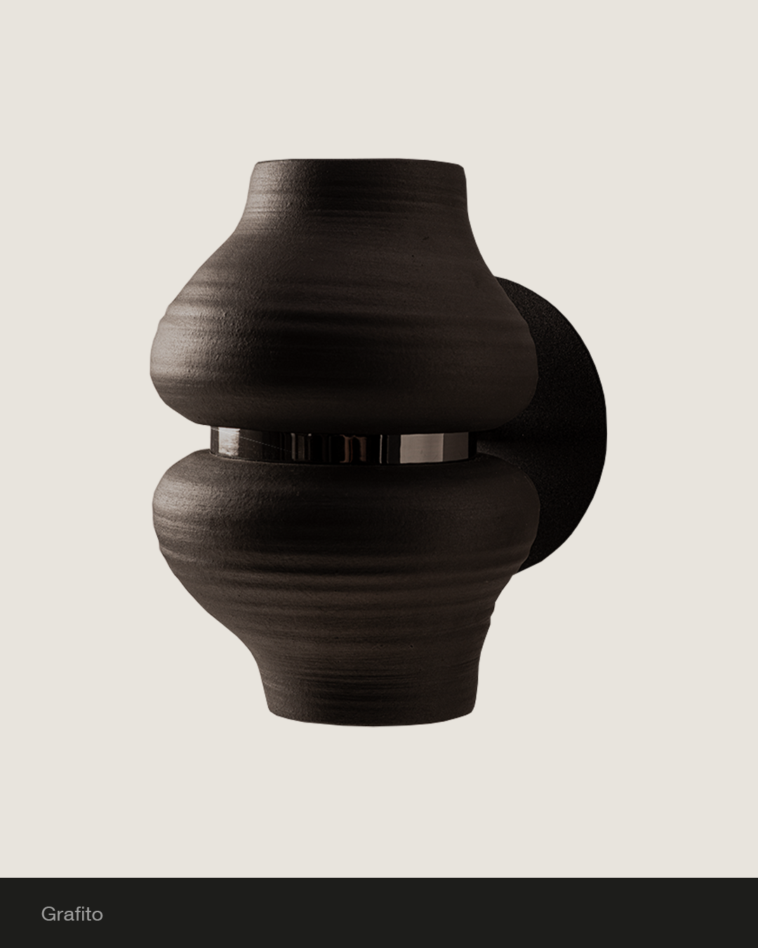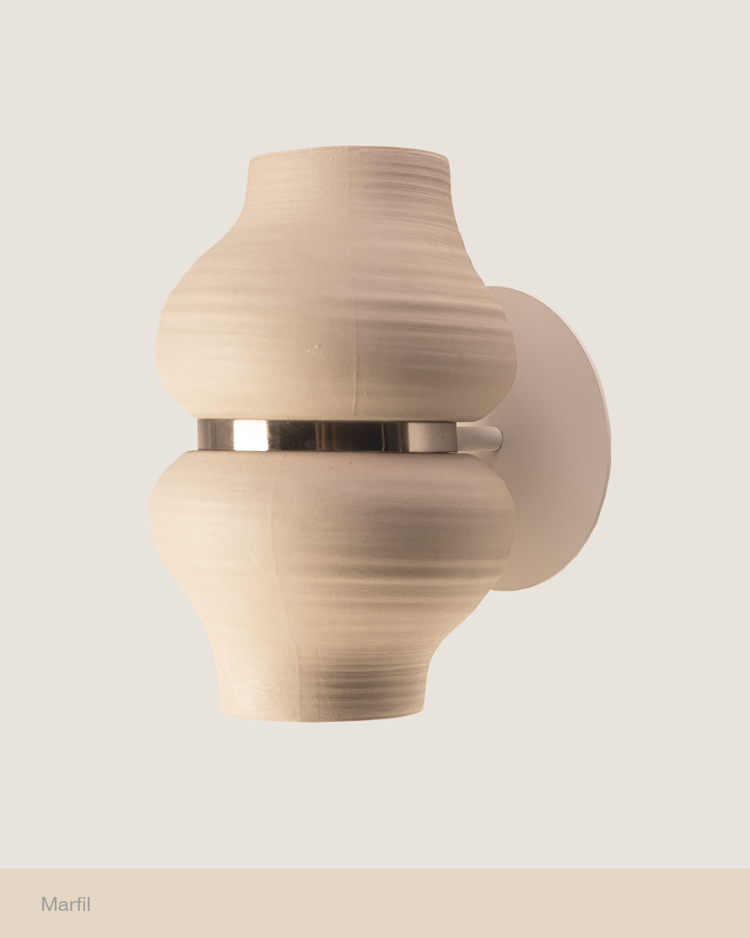 NUDO es el encuentro. Tradición de nuestra tierra y la búsqueda de una identidad propia en el diseño. Una dualidad en la que las ambas partes quedan ligadas fortaleciéndose mutuamente. Lámpara de aplique directa bidireccional. Cuerpo en cerámica hecho a mano y aro metálico. Disco de aplique de acero blanco o negro.