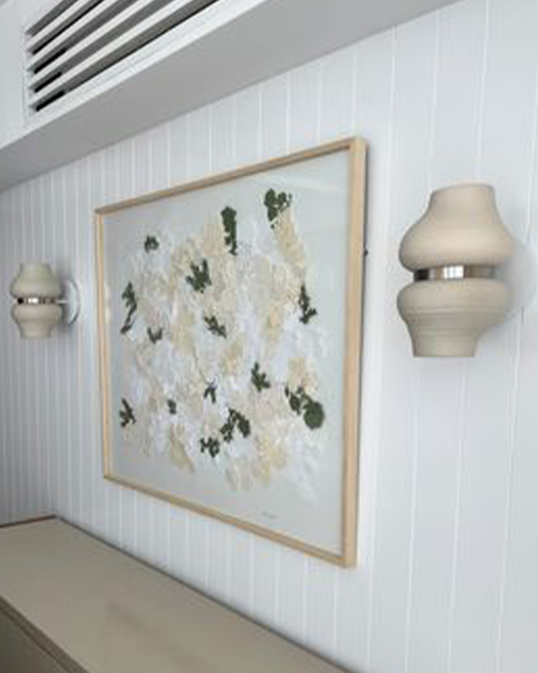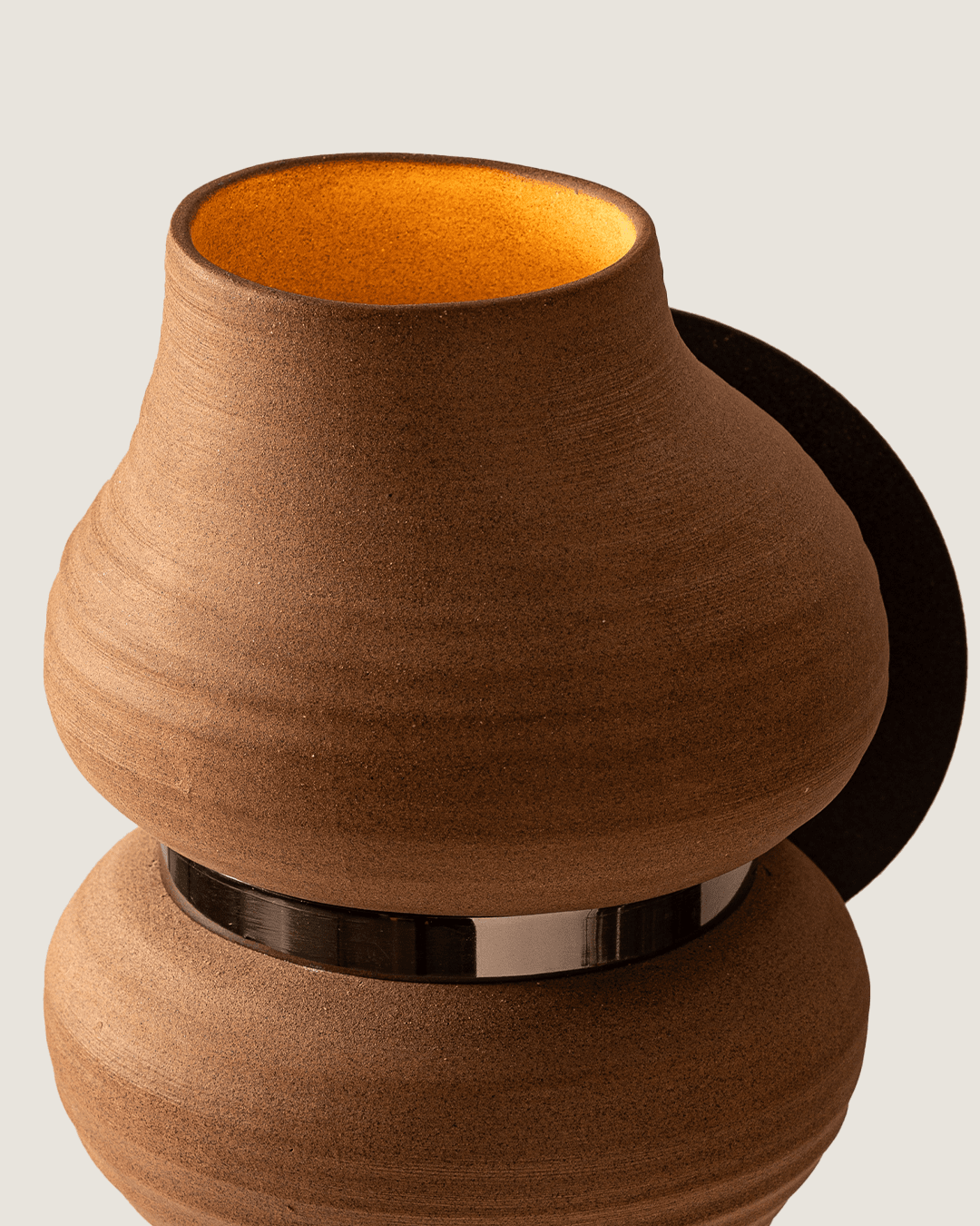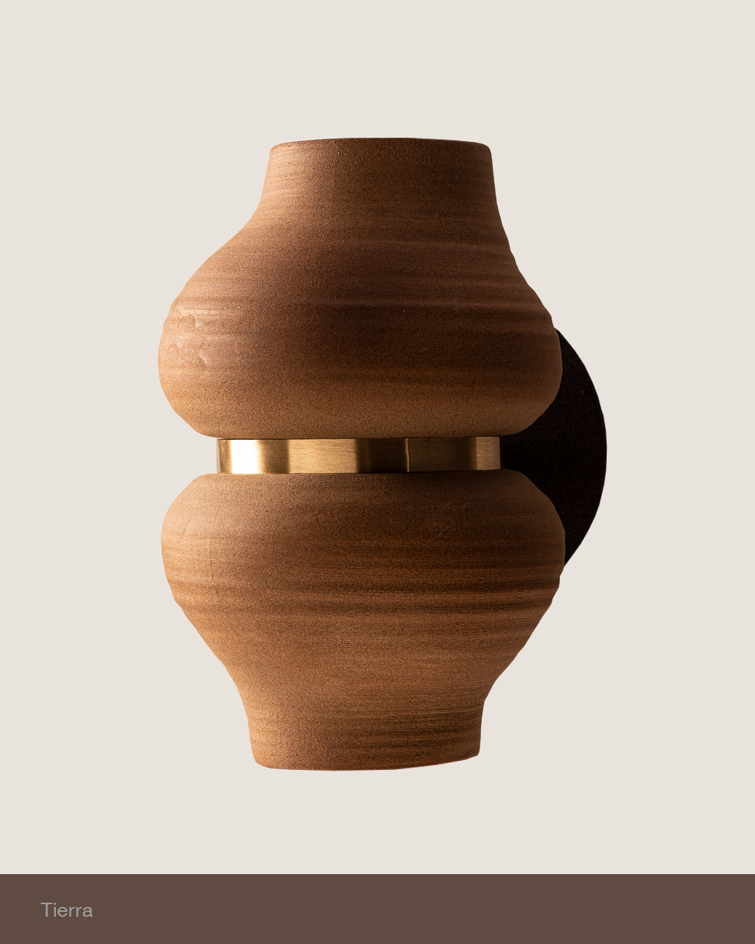 NUDO es el encuentro. Tradición de nuestra tierra y la búsqueda de una identidad propia en el diseño. Una dualidad en la que las ambas partes quedan ligadas fortaleciéndose mutuamente. Lámpara de aplique directa bidireccional. Cuerpo en cerámica hecho a mano y aro metálico. Disco de aplique de acero blanco o negro.