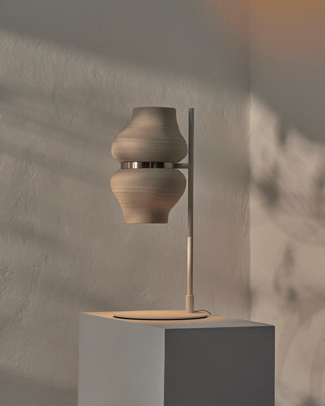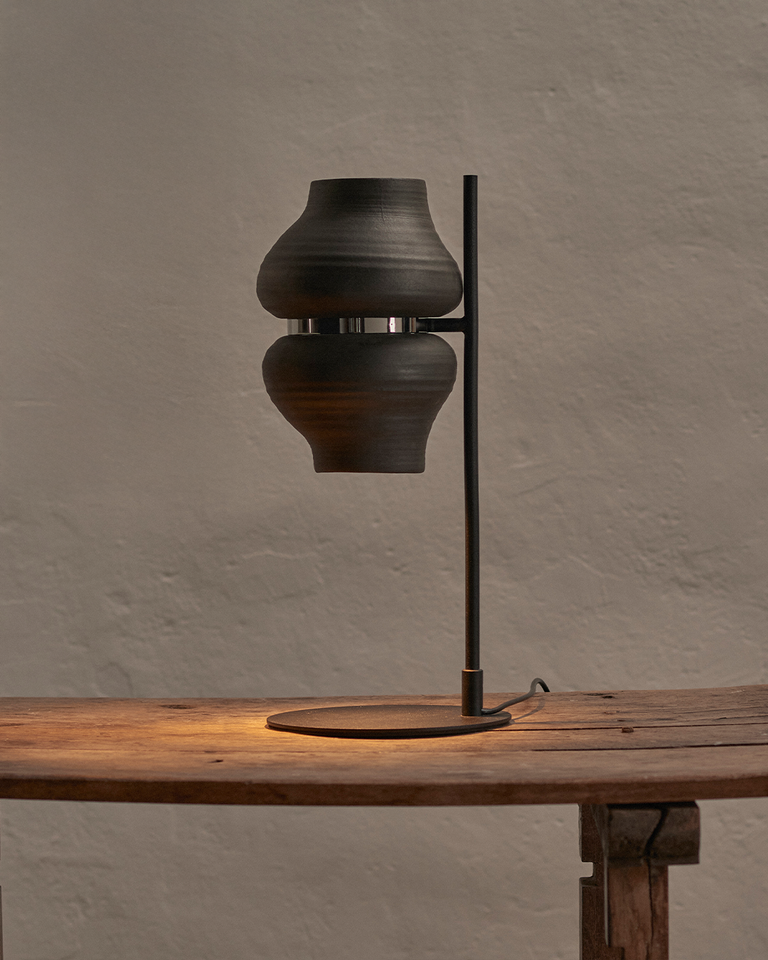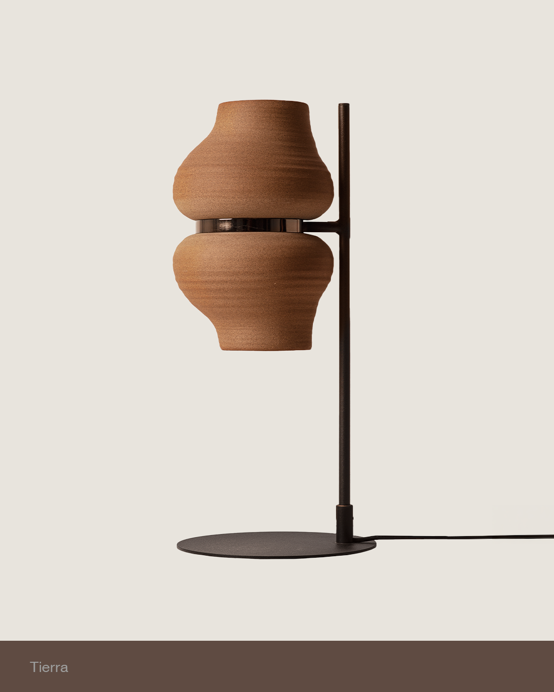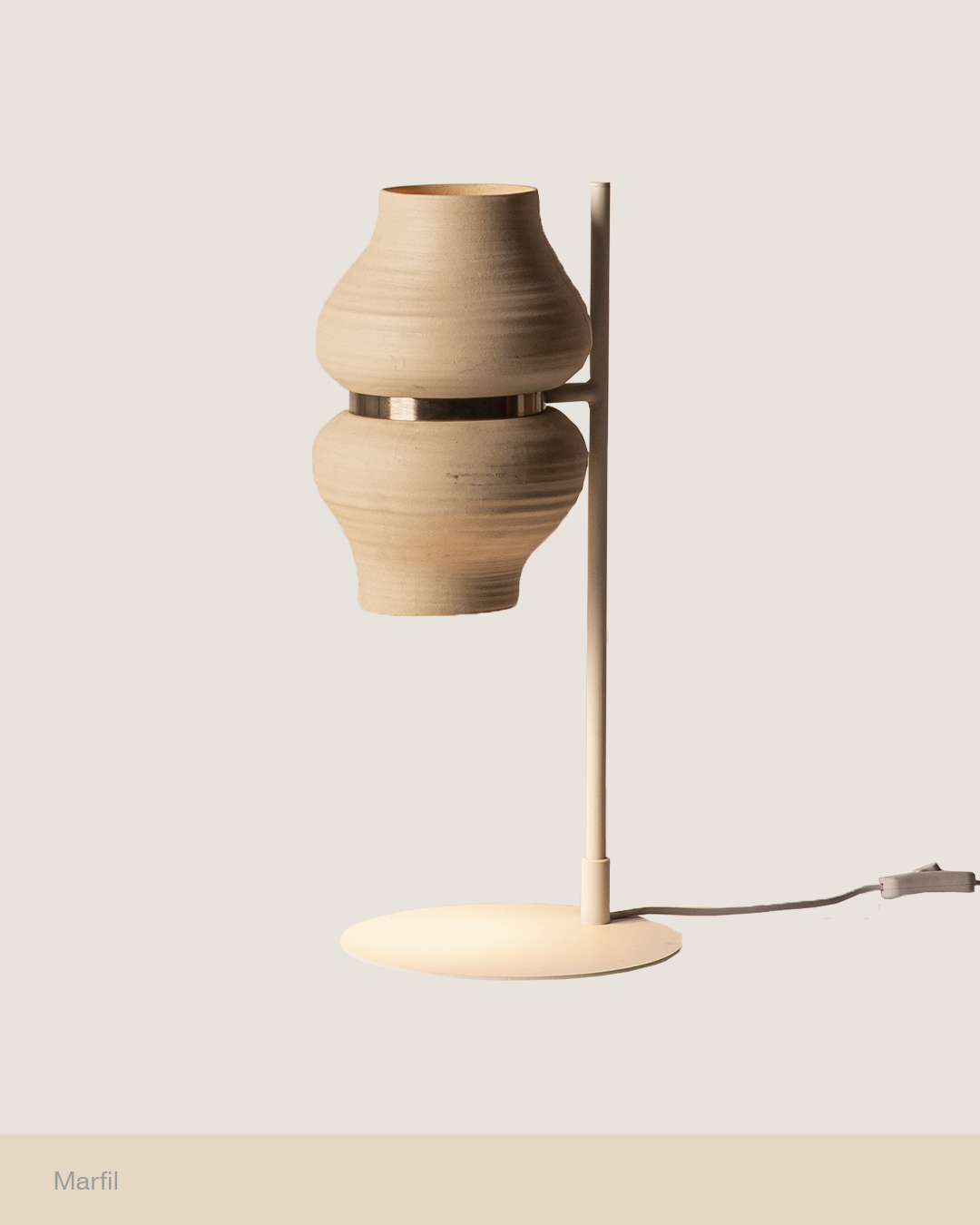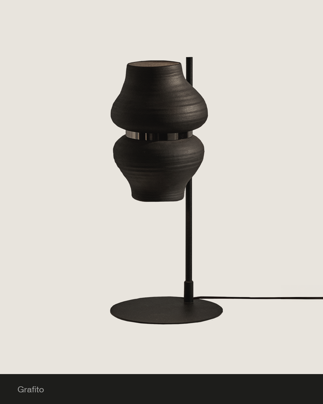 NUDO es el encuentro. Tradición de nuestra tierra y la búsqueda de una identidad propia en el diseño. Una dualidad en la que las ambas partes quedan ligadas fortaleciéndose mutuamente. Lámpara de mesa de luz directa bidireccional. Cuerpo en cerámica hecho a mano y aro metálico. Base y pie de acero blanco o negro. Cable blanco o negro con interruptor on/off.