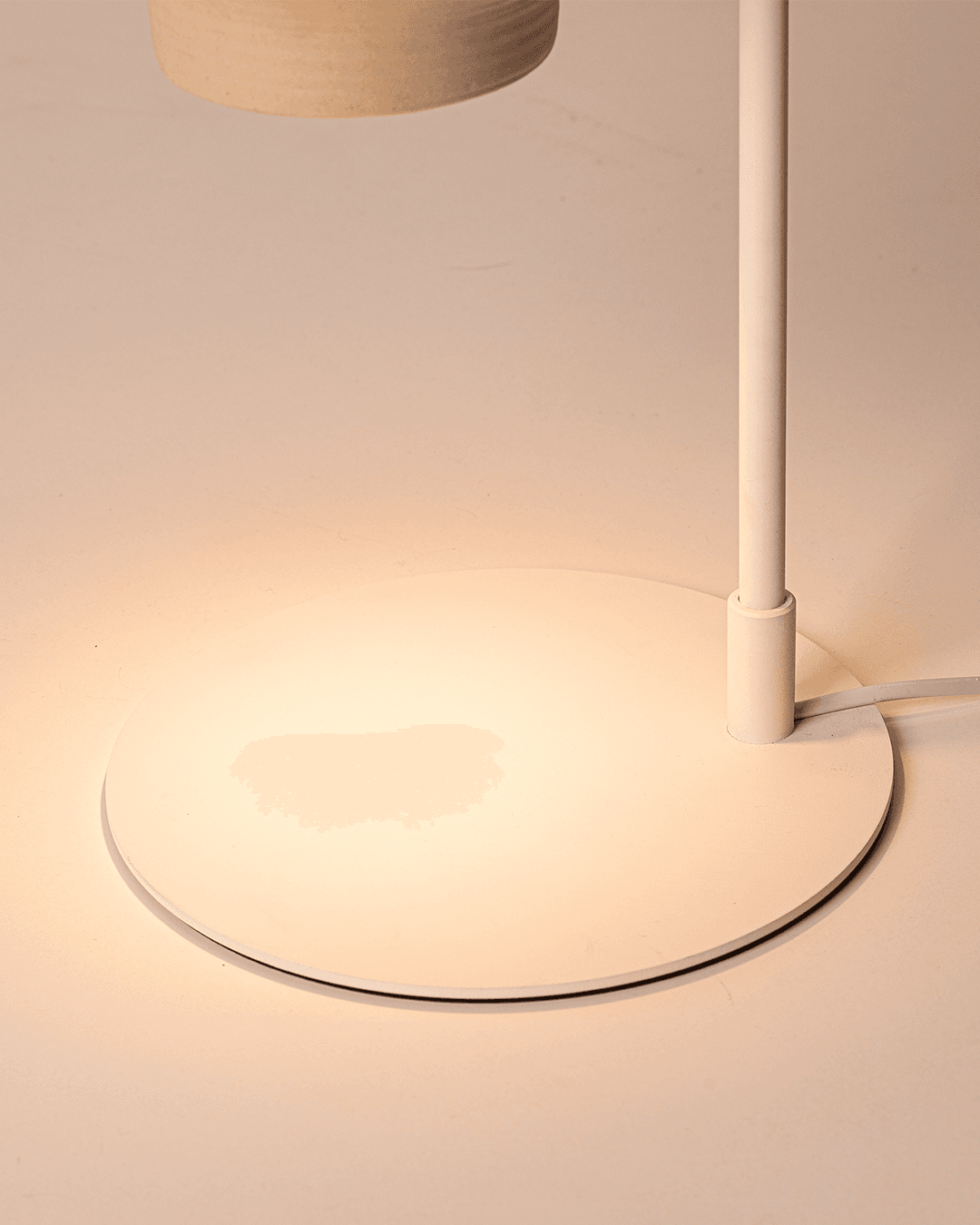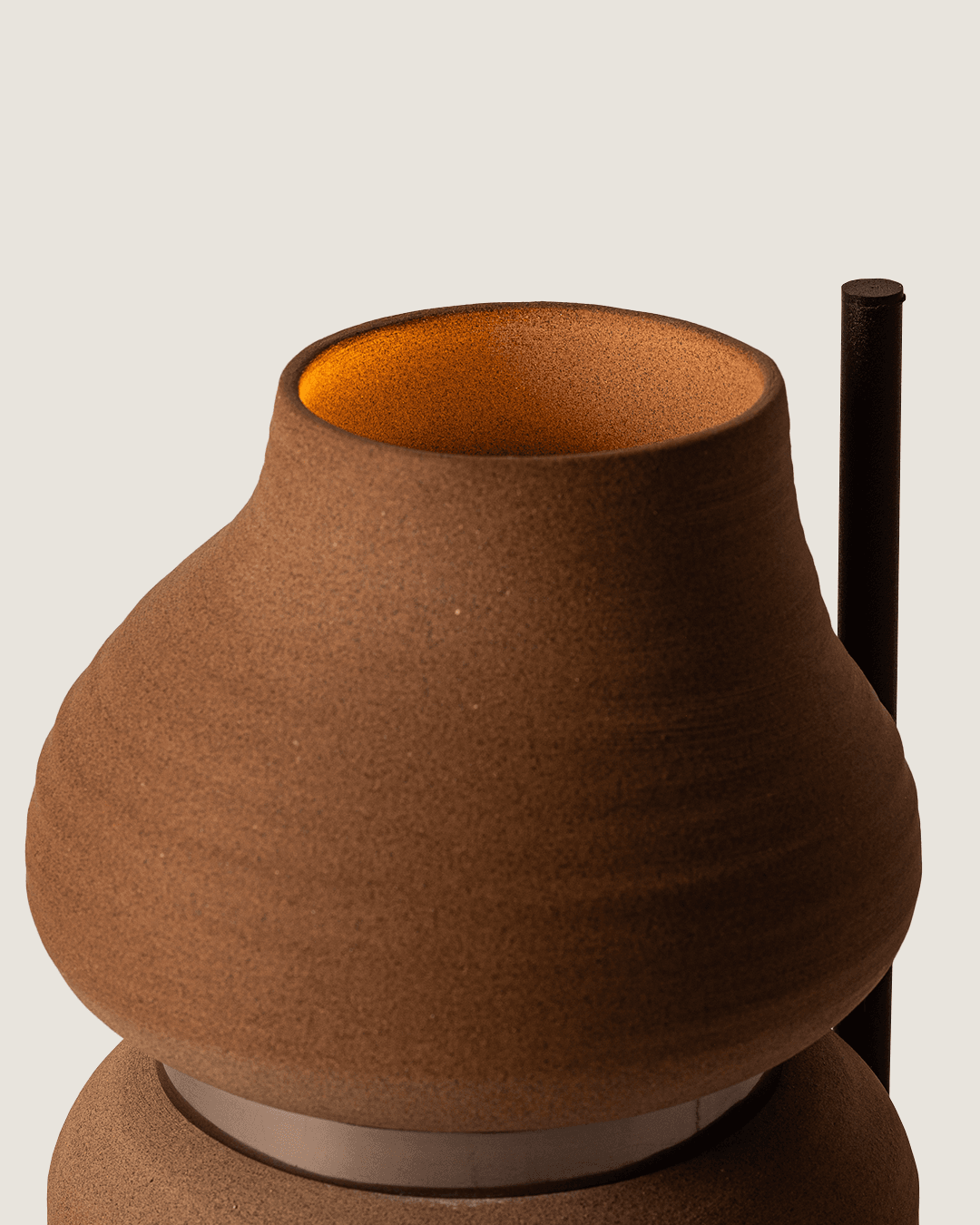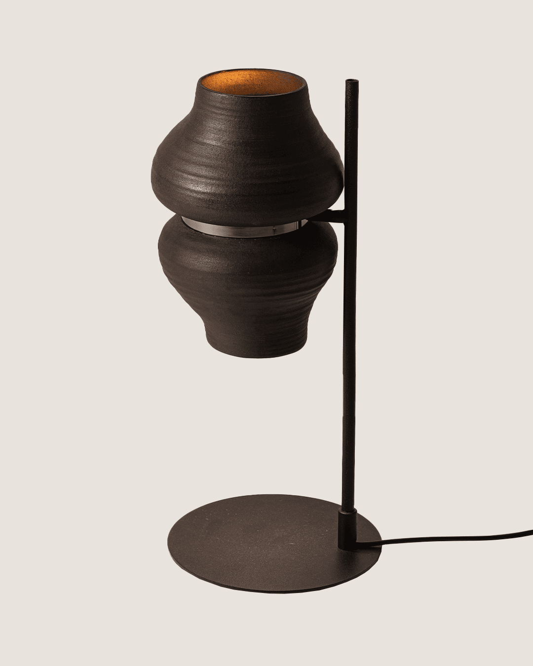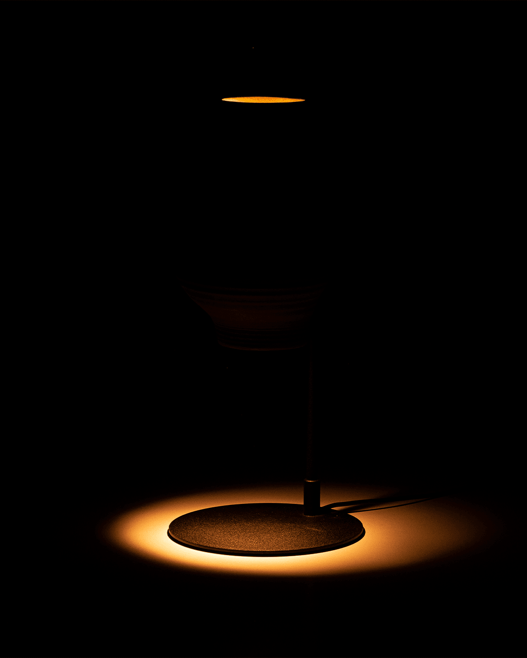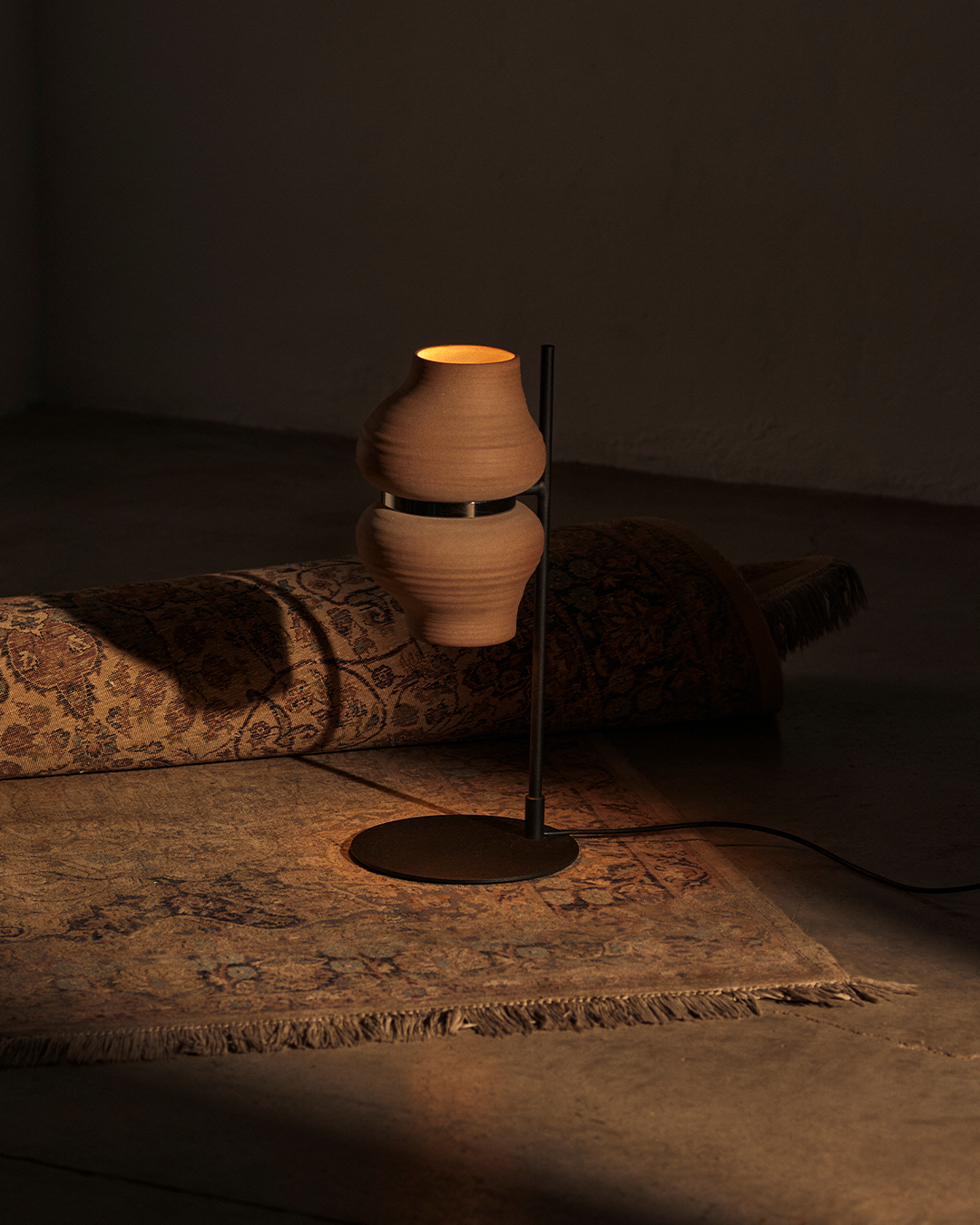 NUDO es el encuentro. Tradición de nuestra tierra y la búsqueda de una identidad propia en el diseño. Una dualidad en la que las ambas partes quedan ligadas fortaleciéndose mutuamente. Lámpara de mesa de luz directa bidireccional. Cuerpo en cerámica hecho a mano y aro metálico. Base y pie de acero blanco o negro. Cable blanco o negro con interruptor on/off.