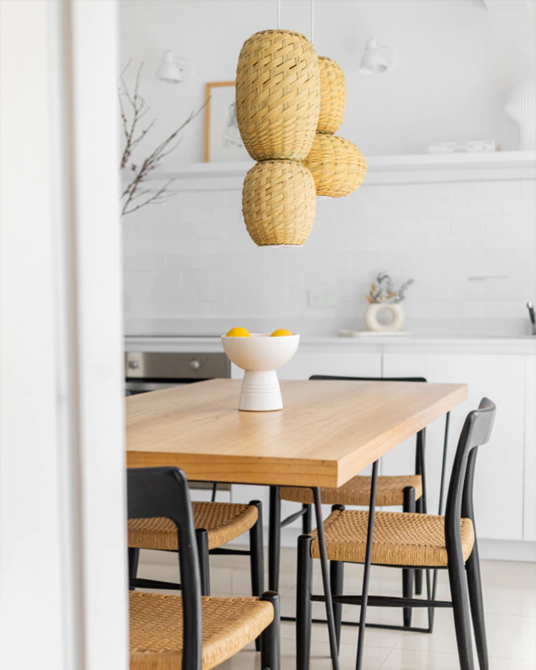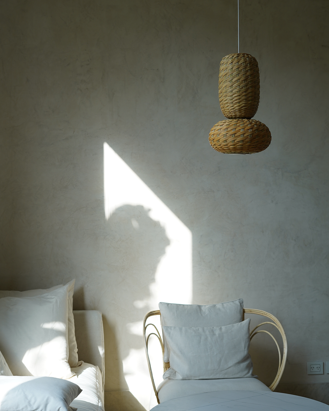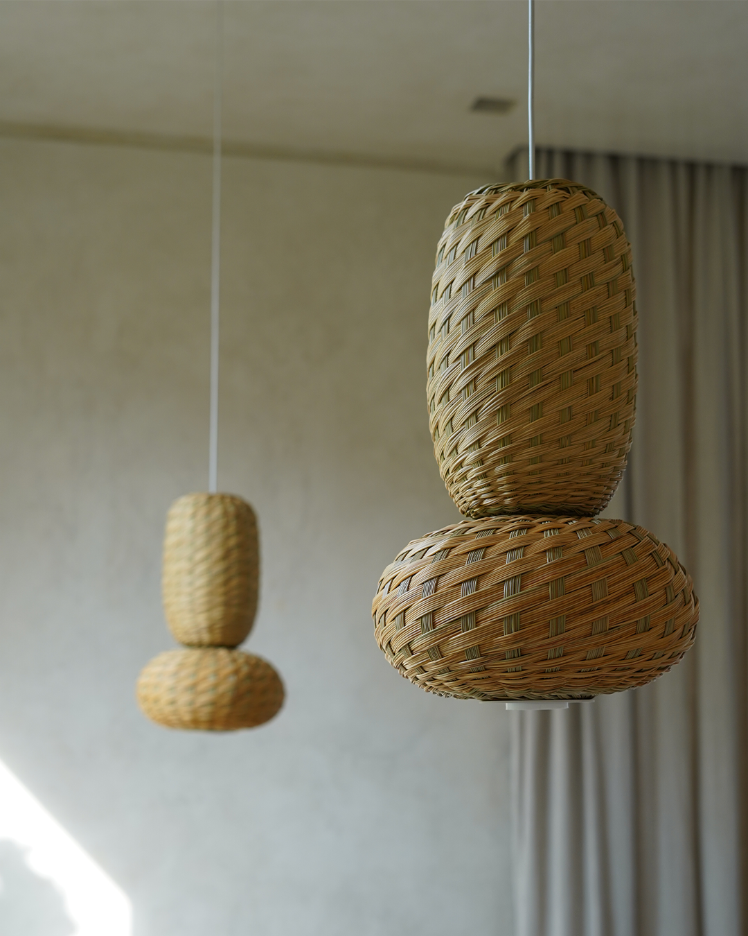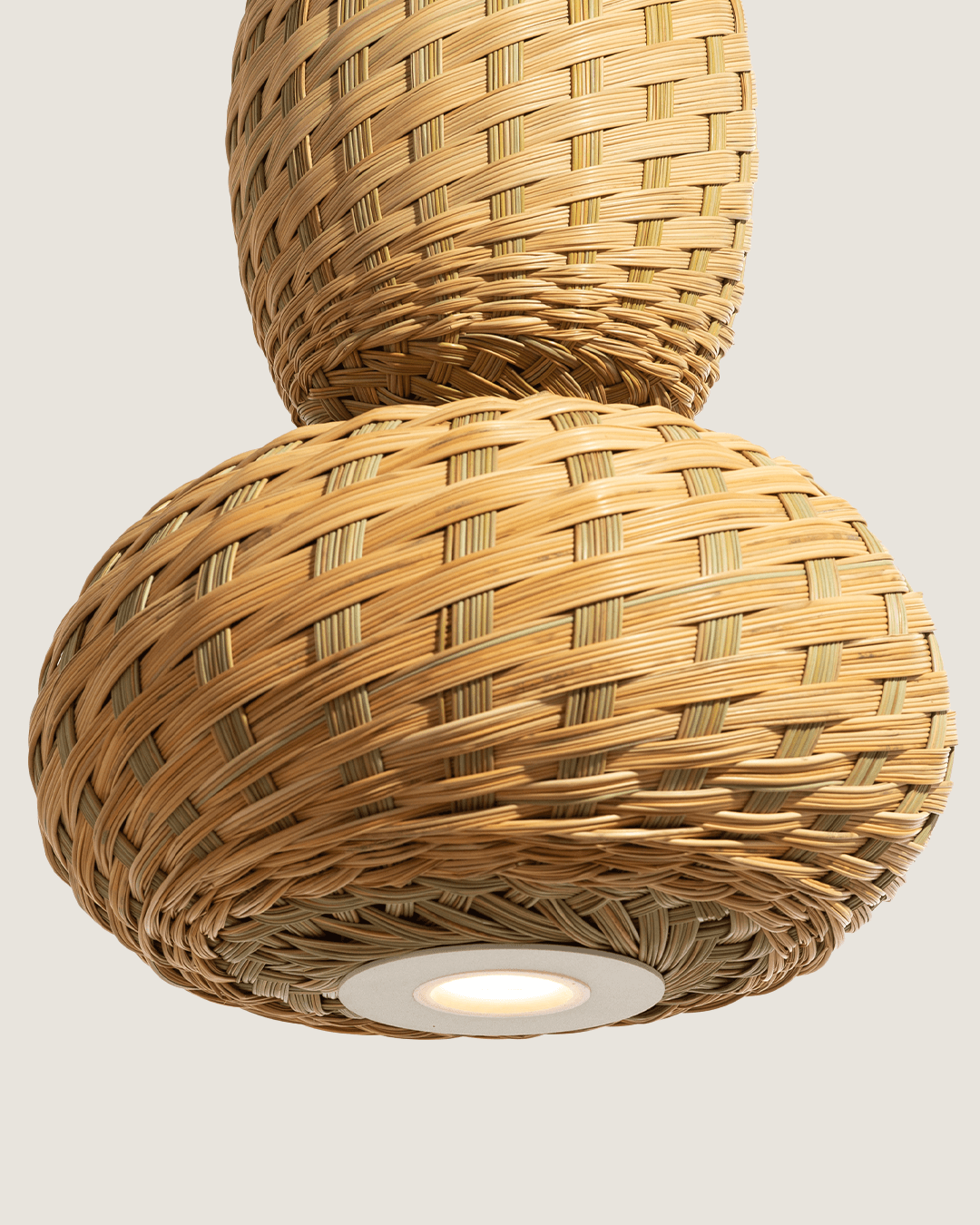 El paisaje del valle de Catamarca en Argentina surge como desafío estético de siluetas, ondulaciones y valles que descansan al pie de la cordillera de los Andes. Allí crece el “simbol”, una fibra silvestre que protagoniza este ejercicio de cestería contemporánea. Atrapar el paisaje en la forma, un acto que nos enfrenta a la simplicidad y honestidad brutal del material con líneas suaves como si se formaran de la erosión. Lámpara de suspensión de luz semi directa. Cuerpo en tejido de fibra natural «simbol» hecho a mano y disco de aluminio. Tensores de acero galvanizado y cable blanco o negro.